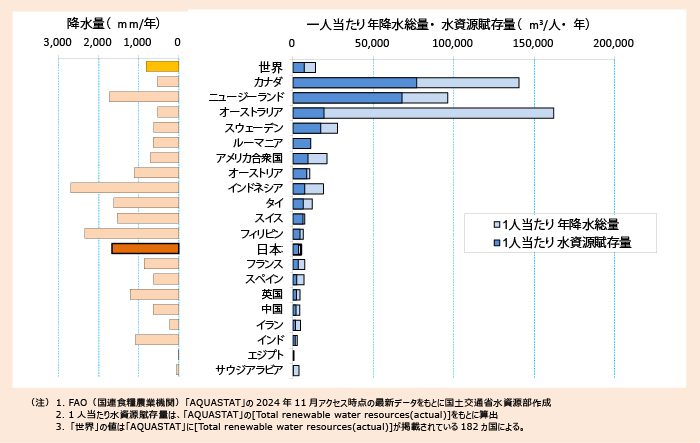 我が国は、世界でも有数の多⾬地帯であるモンス−ンアジアの東端に位置し、FAO(国連 ⾷糧農業機関)「AQUASTAT」の公表データによると、年降⽔量は約1,668mmとなっており、これは、世界の年降⽔量である約815mmの約2.0倍となっています。