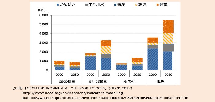 経済協⼒開発機構(OECD:Organisation for Economic Co-operation and Development)の報告『OECD Environmental Outlook to 2050』によれば、世界の⽔需要は、製 造業、⽕⼒発電、⽣活⽤⽔などに起因する需要増により、2050 年までに 55%程度の増加が⾒込まれています。